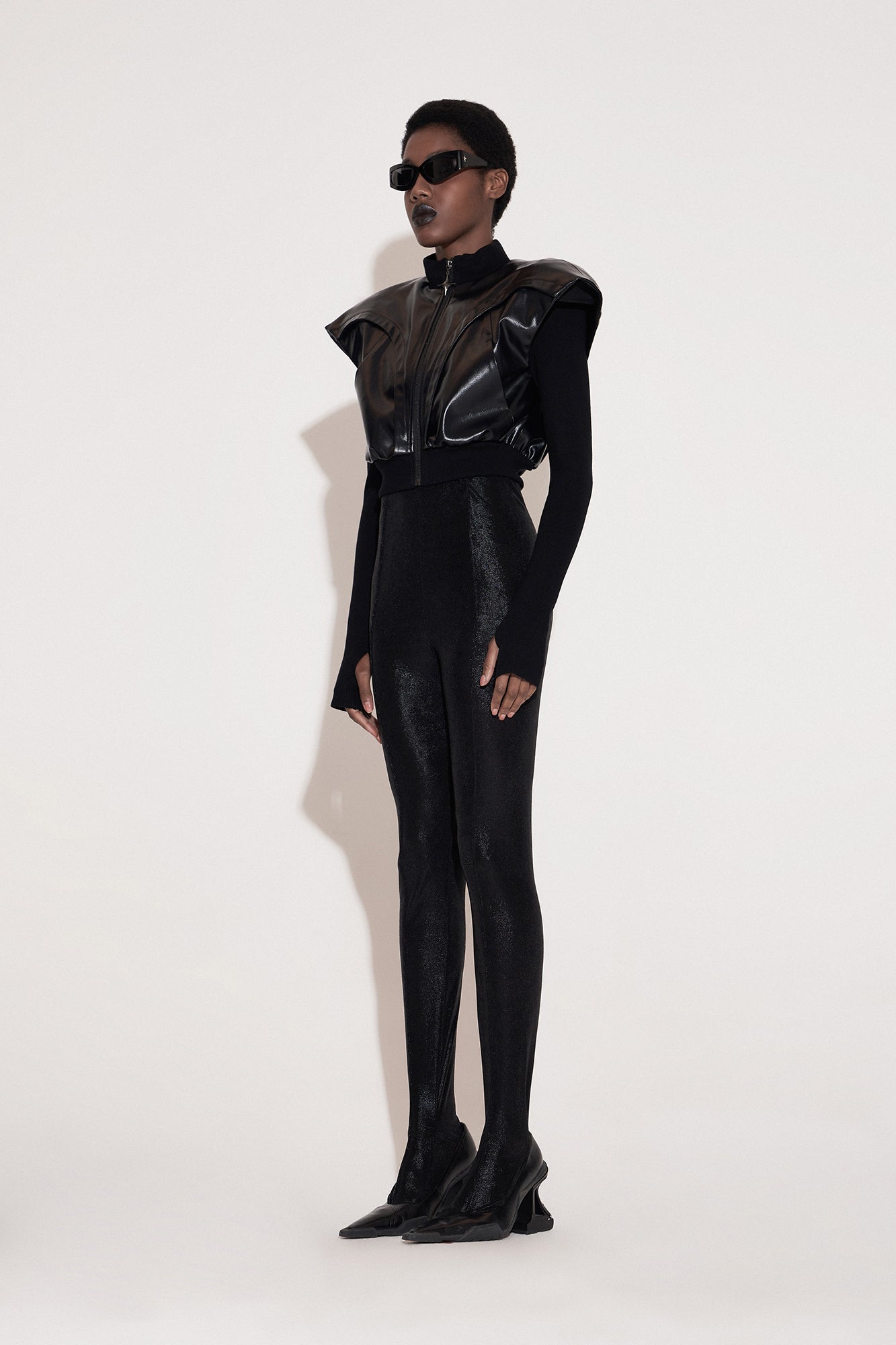 Three-dimensional wide shoulder cutting, through the built-in detachable shoulder pads to create a broad shoulder line, combined with crisp leather support profile, forming a functional future silhouette, cool feeling full, like a futuristic female warrior armor