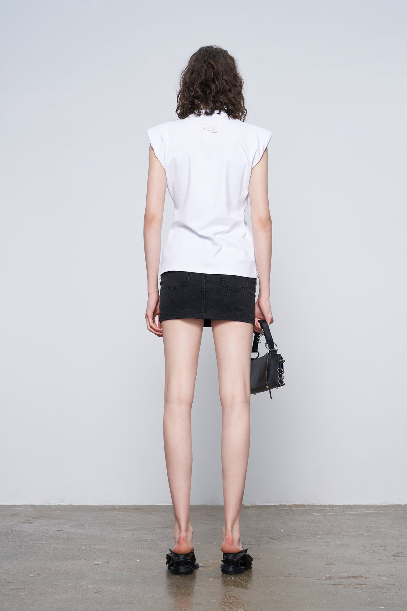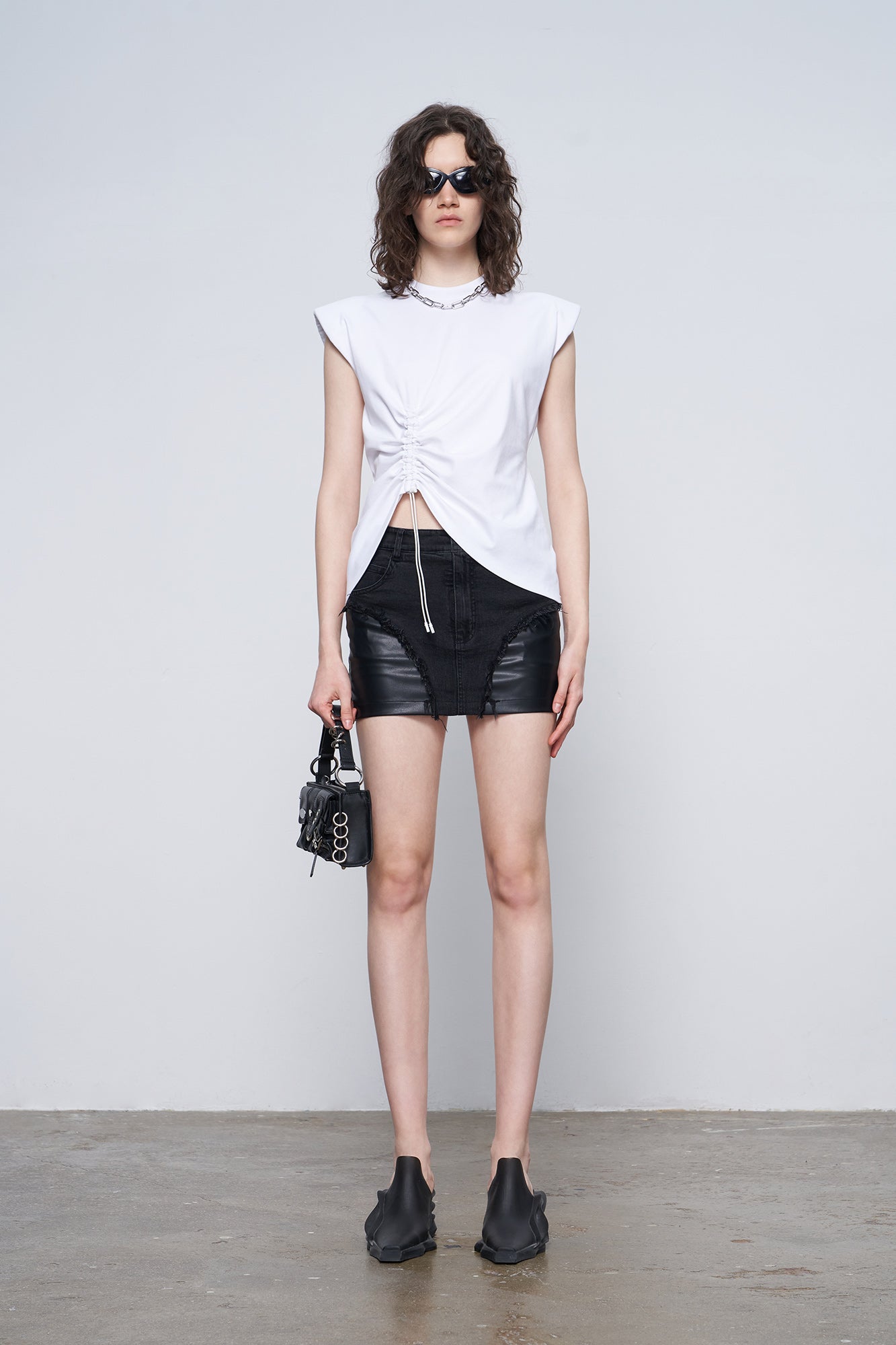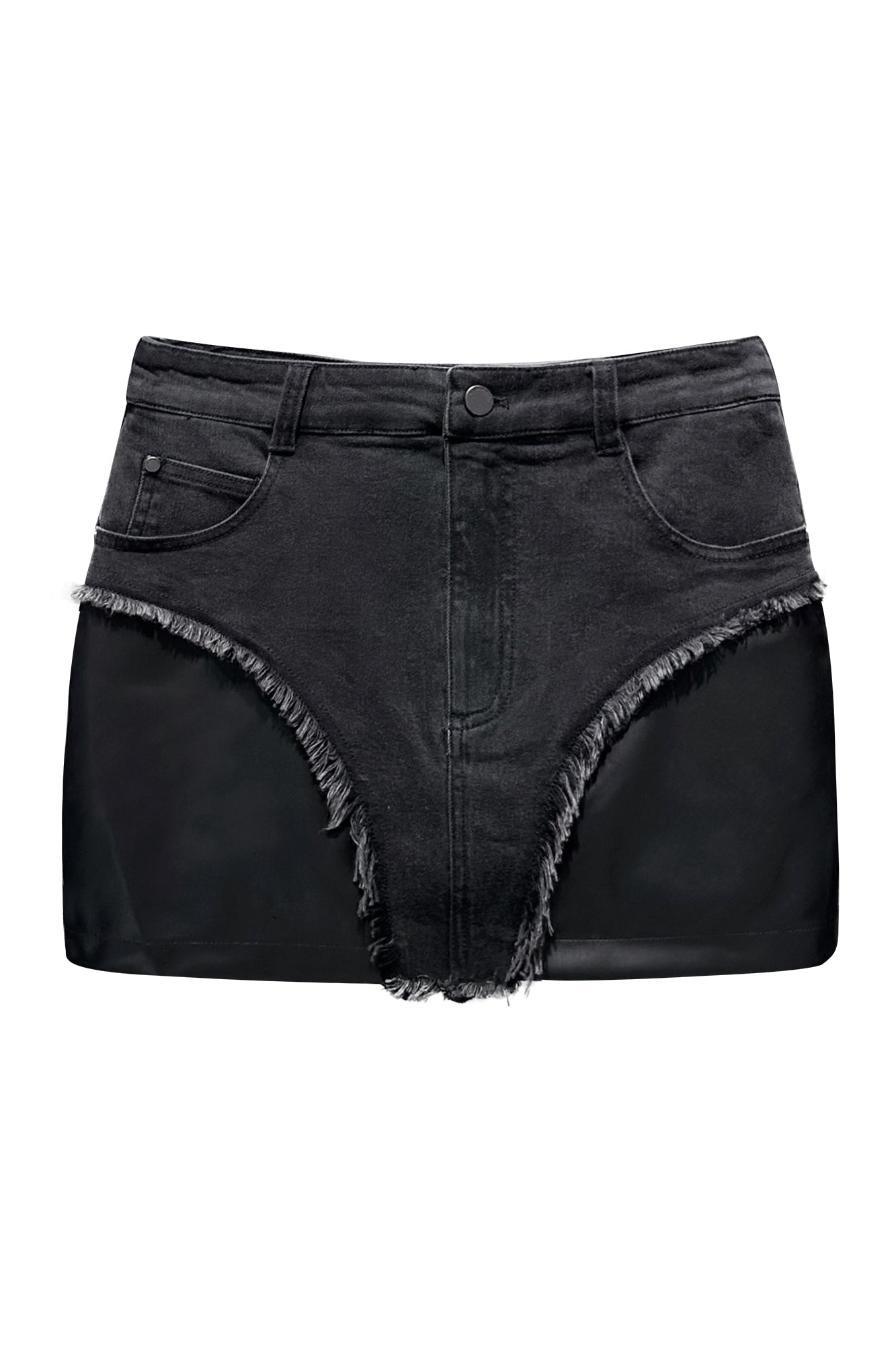 The short skirt with the four pointed star arc segmentation design of the brand, spliced with denim and leather fabric,
